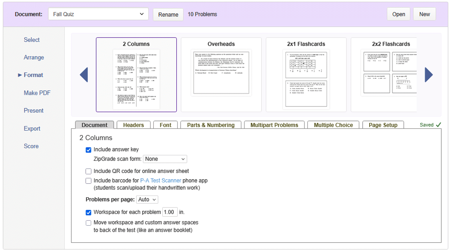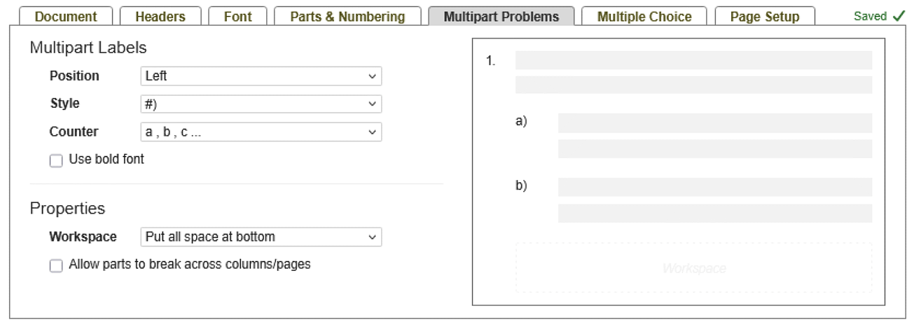 Customize how multipart problems appear in your document in the Multipart Problems tab.