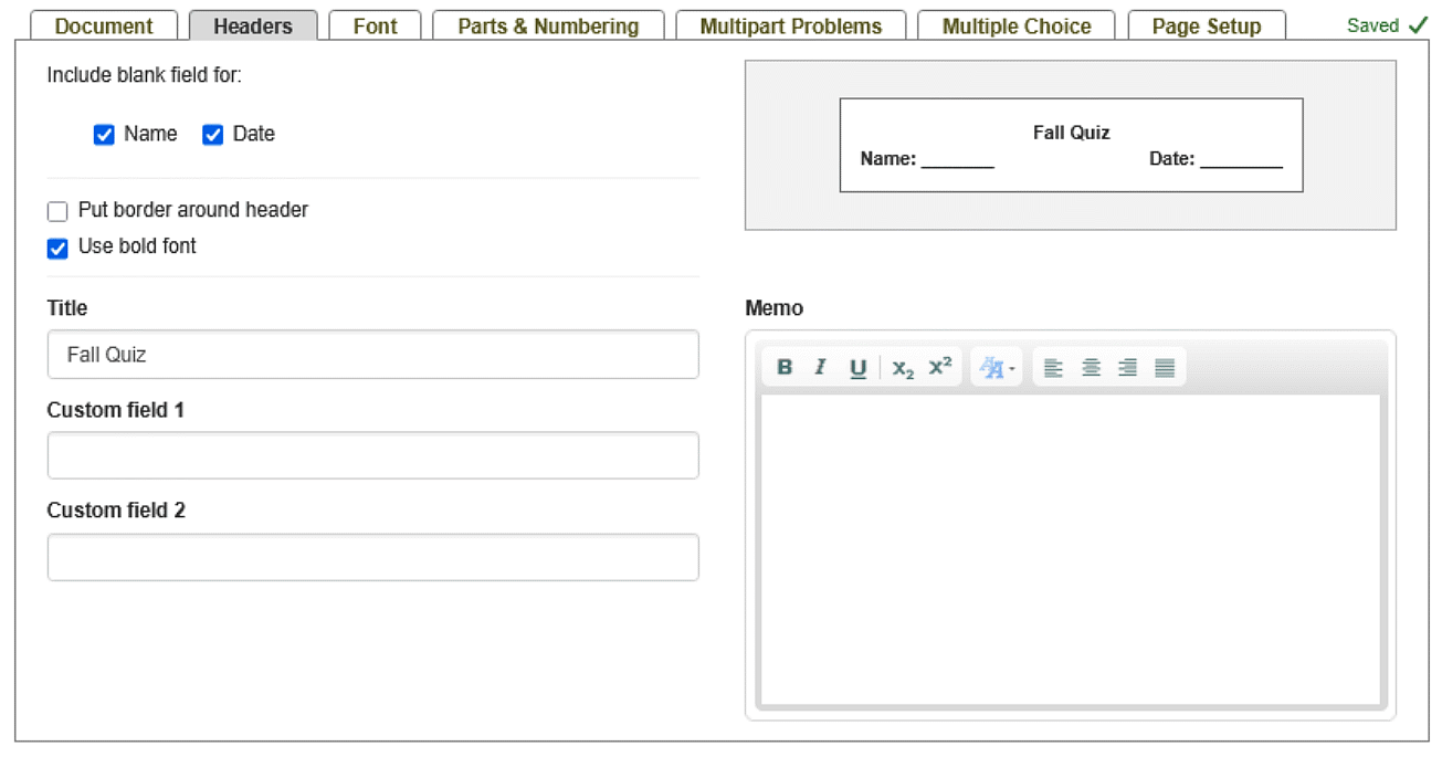 • Use the custom field boxes to add your own blank fields or any useful information about the test (e.g., Class, Period, Teacher Name, etc). Both custom fields will be printed on the the top of the first page. The contents of Custom Field 1 will be printed on the bottom-left corner of additional pages.