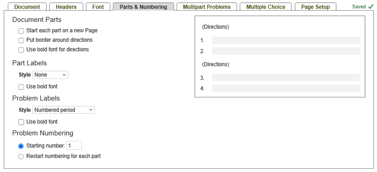 • Use the checkboxes to change whether or not each part starts a new page, put a border around the directions or use bold font for directions.