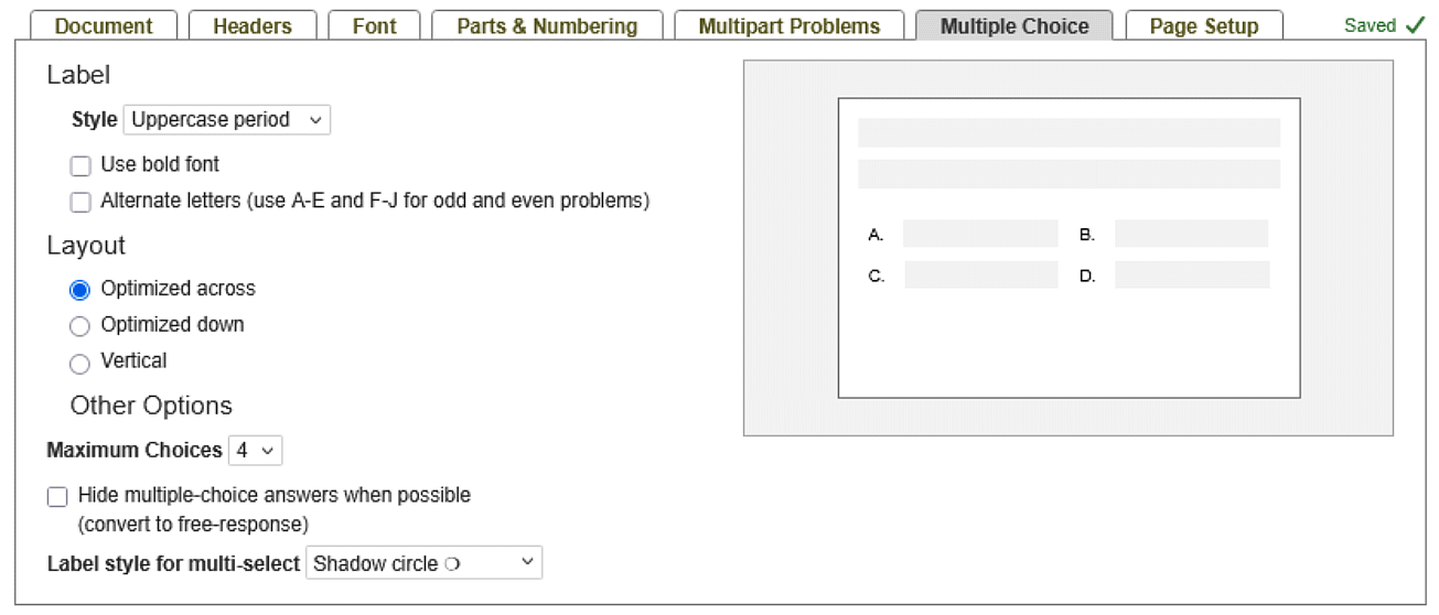 The Multiple Choice tab lets you change the way multiple choice options are presented in your document.