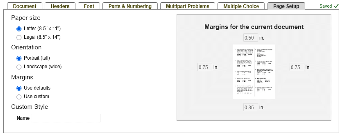 The Page Setup tab allows you to choose the paper size and margins for your document.